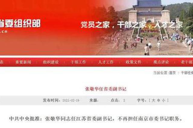 张敬华任江苏省委副书记 不再担任南京市委书记职务 江苏省人民政府网站 02月19日 09:37 关注 确定不再关注此人吗 中共中央批准:张敬华同志任江苏省委副书记,不再担任南京市委书记职务。 分享文章到: