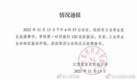 据江苏启东实验小学通报,11月15日下午4时57分左右,该校有3名学生发生坠楼事件。学校第一时间拨打120送医救治。目前,3名学生生命体征基本平稳。具体原因公安机关正在调查中。