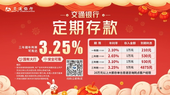 交通银行常州分行三年期定期储蓄年利率可高达3.25%