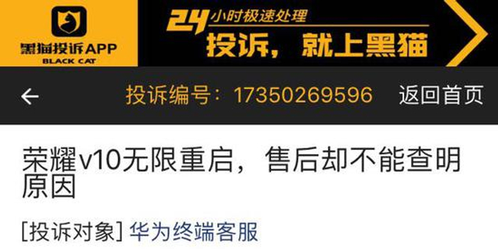 网友投诉华为荣耀V10手机:无限重启 售后无法查明原因
