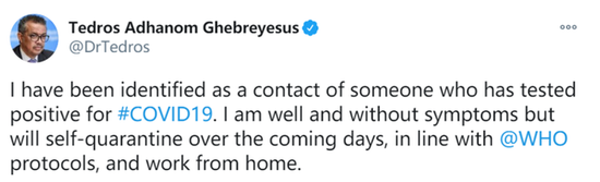 谭德塞确认曾接触新冠病毒检测阳性者 将进行自我隔离