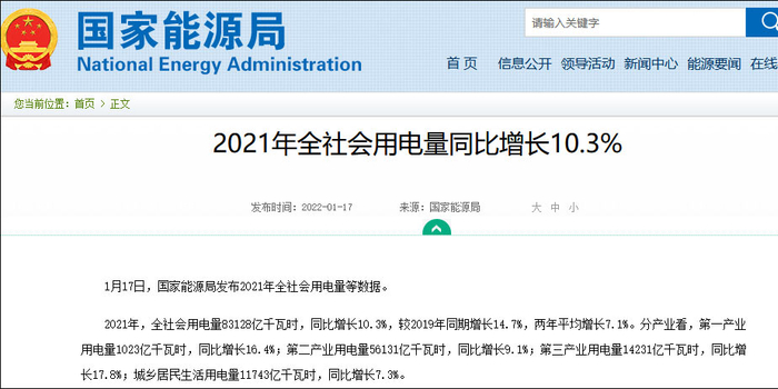 关注1月17日,国家能源局发布2021年全社会用电量等数据。