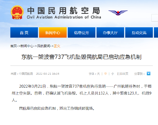 2022年3月21日,东航一架波音737客机在执行昆明——广州航班任务时,于梧州上空失联。目前,已确认该飞机坠毁。机上人员共132人,其中旅客123人、机组9人。