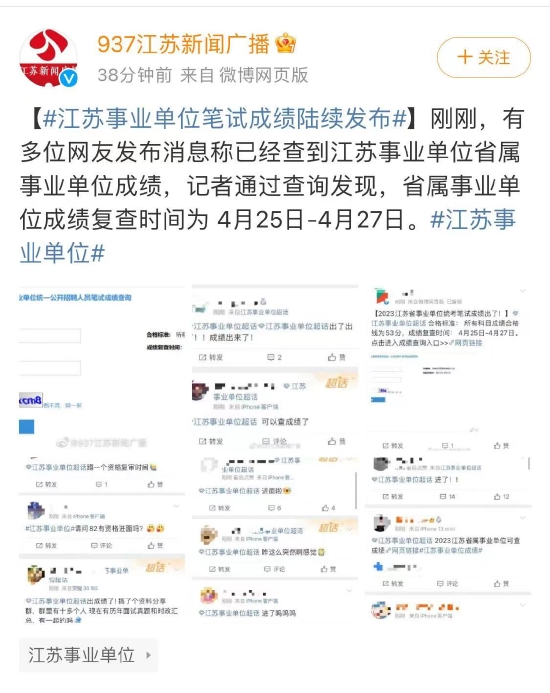 江苏事业单位笔试成绩陆续发布 江苏新闻广播 04月24日 12:05 关注 确定不再关注此人吗 据@937江苏新闻广播,有多位网友发布消息称已经查到江苏事业单位省属事业单位成绩。记者通过查询发现,省属事业单位成绩复查时间为 4月25日-4月27日。 分享文章到: