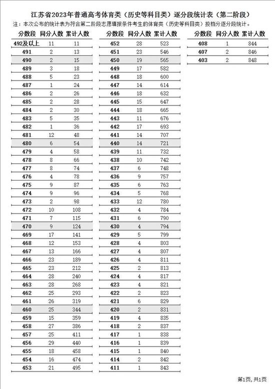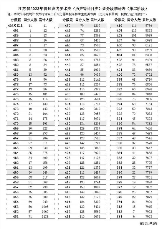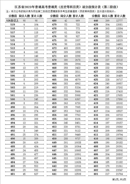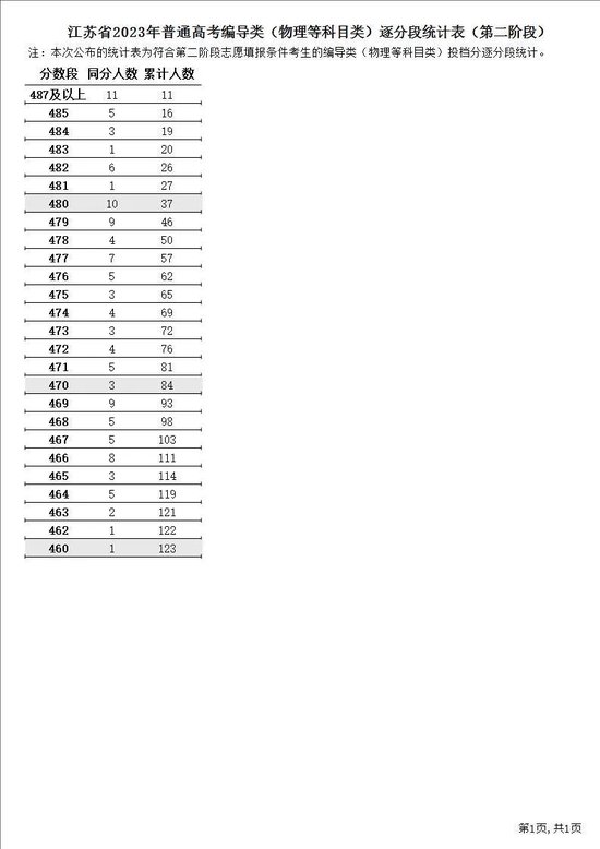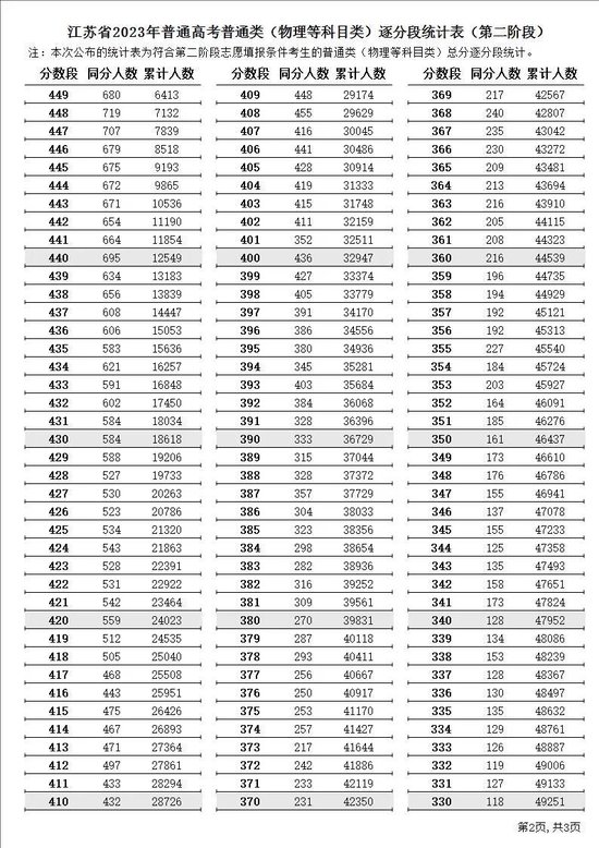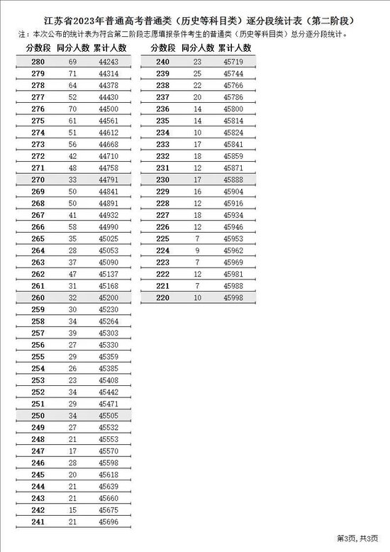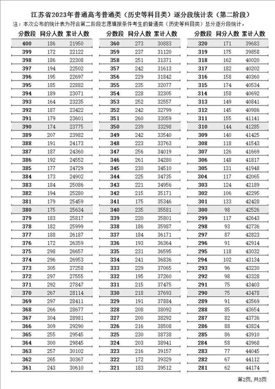 江苏省2023年普通高考逐分段统计表(第二阶段)