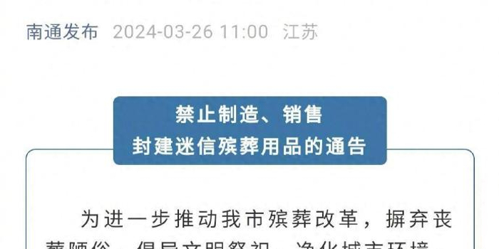 江苏南通:全面禁止制造销售封建迷信殡葬用品 南通发布 03月27日 09:26 关注 确定不再关注此人吗 3月26日,江苏南通发布《禁止制造、销售封建迷信殡葬用品的通告》,要求全市范围内禁止任何单位和个人制造、销售冥币纸钱、纸扎实物等封建迷信殡葬用品。 分享文章到: