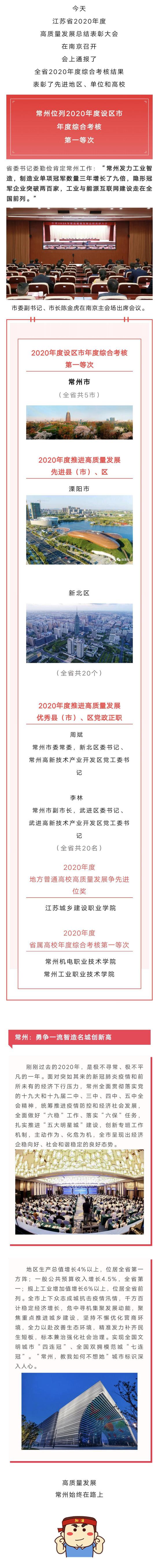 常州,第一等次! 新浪常州 03月30日 15:57 关注 确定不再关注此人吗 摘要: 今天,江苏省2020年度高质量发展总结表彰大会在南京召开会上通报了全省2020年度综合考核结果,表彰了先进地区、单位和高校,常州位列2020年度设区市年度综合考核第一等次。 (常州发布) 分享文章到: