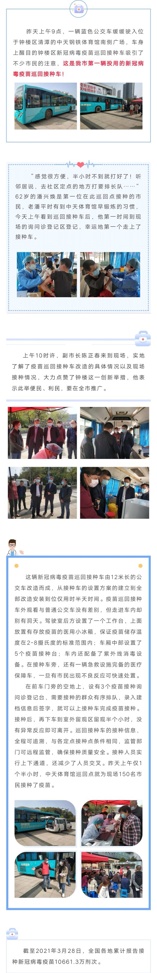 全市首辆!钟楼区投用新冠病毒疫苗巡回接种车 新浪常州 03月31日 10:22 关注 确定不再关注此人吗 摘要: 3月28日上午9点,一辆蓝色公交车缓缓驶入位于钟楼区清潭的中天钢铁体育馆南侧广场,车身上醒目的钟楼区新冠病毒疫苗巡回接种车吸引了不少市民的注意,这是我市第一辆投用的新冠病毒疫苗巡回接种车! (常州发布) 分享文章到: