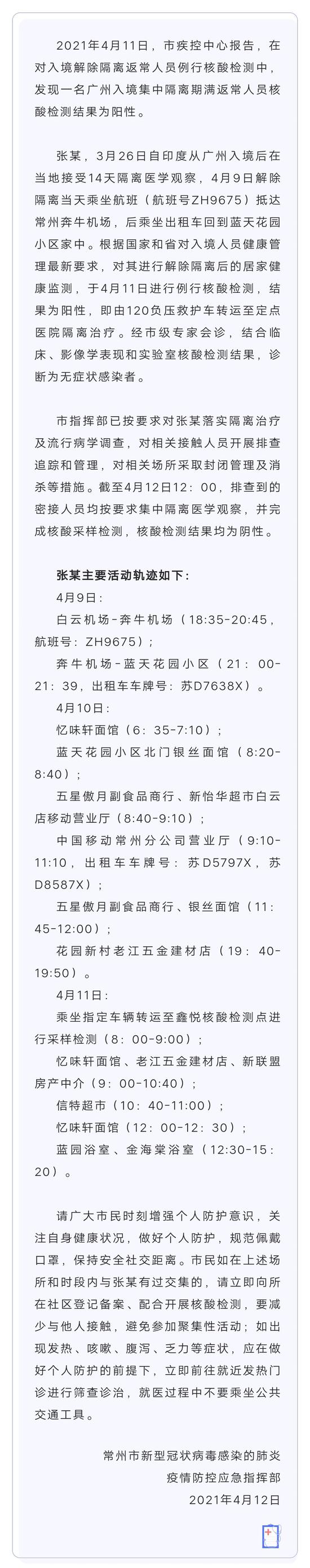 关于一例境外入境人员解除隔离后核酸检测阳性的情况说明 新浪常州 04月13日 10:31 关注 确定不再关注此人吗 摘要: 2021年4月11日,市疾控中心报告,在对入境解除隔离返常人员例行核酸检测中,发现一名广州入境集中隔离期满返常人员核酸检测结果为阳性。 (常州发布) 分享文章到: