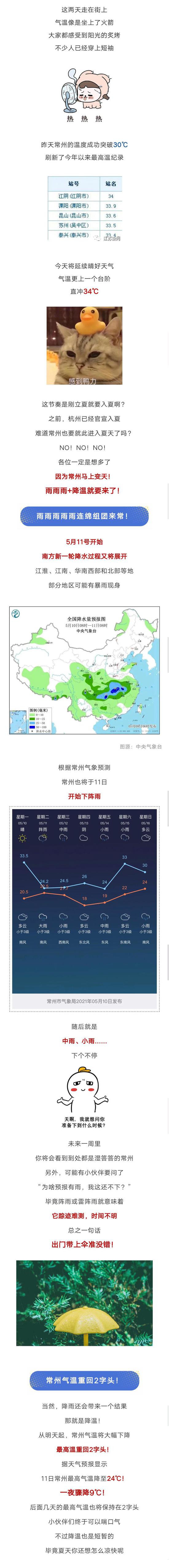 直冲34℃再骤降9℃!本周常州天气太刺激! 新浪常州 05月10日 10:31 关注 确定不再关注此人吗 摘要: 5月11号开始,南方新一轮降水过程又将展开,江淮、江南、华南西部和北部等地 部分地区可能有暴雨现身。 (常州发布) 分享文章到: