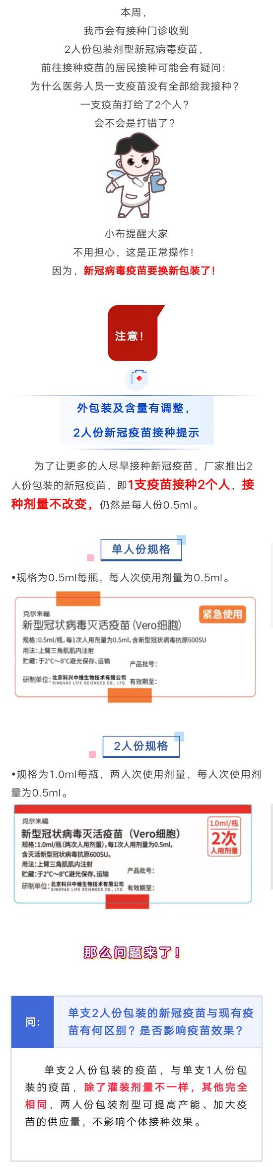 新变化!新冠疫苗可以接种“半支”了! 新浪常州 05月10日 10:33 关注 确定不再关注此人吗 摘要: 本周,我市会有接种门诊收到2人份包装剂型新冠病毒疫苗,前往接种疫苗的居民接种可能会有疑问:为什么医务人员一支疫苗没有全部给我接种?一支疫苗打给了2个人?会不会是打错了? (常州发布) 分享文章到: