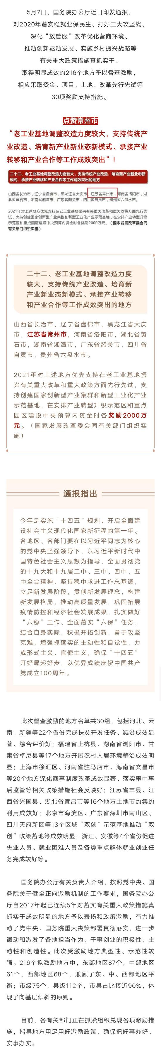 2000万元奖励!常州被国办通报表扬 新浪常州 05月10日 10:06 关注 确定不再关注此人吗 摘要: 5月7日,国务院办公厅近日印发通报,对2020年落实稳就业保民生、打好三大攻坚战、深化“放管服”改革优化营商环境、推动创新驱动发展、实施乡村振兴战略等有关重大政策措施真抓实干、取得明显成效的216个地方予以督查激励,相应采取资金、项目、土地、改革先行先试等30项奖励支持措施。 (常州发布) 分享文章到: