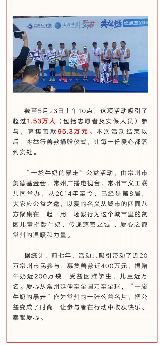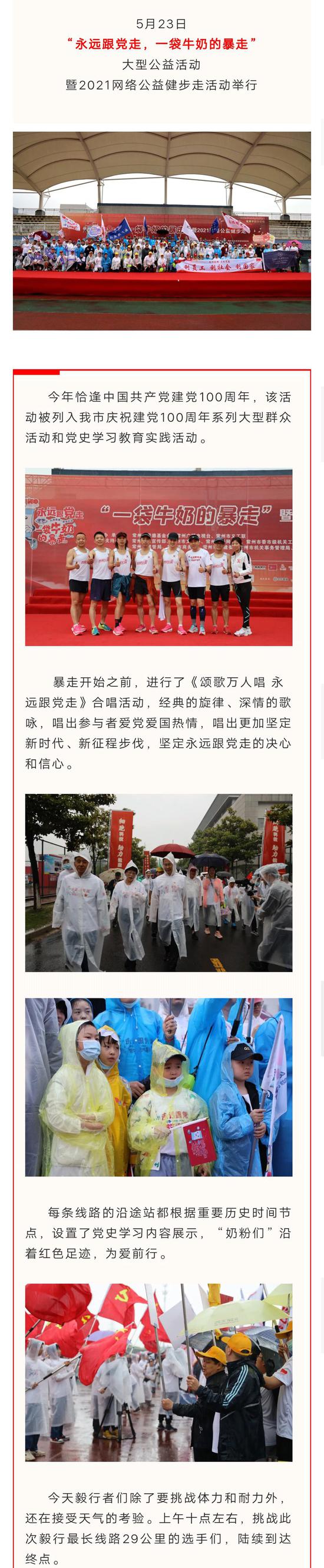 8年公益 不忘初心!2021“一袋牛奶的暴走”风雨中前行 新浪常州 05月24日 10:27 关注 确定不再关注此人吗 摘要: 5月23日,“永远跟党走,一袋牛奶的暴走”大型公益活动暨2021网络公益健步走活动举行。 分享文章到: