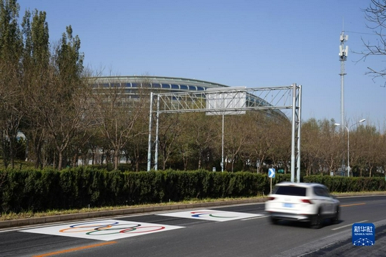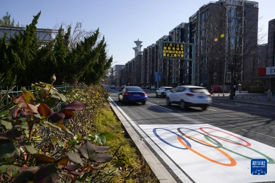 这是11月14日拍摄的北京市奥林西路路面上的奥运会和残奥会标识。
