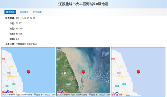 江苏盐城市大丰区海域发生5.0级地震 新华网 11月18日 09:35 关注 确定不再关注此人吗 摘要: 中国地震台网正式测定:11月17日13时54分在江苏盐城市大丰区海域(北纬33.50度,东经121.19度)发生5.0级地震,震源深度17千米。 中国地震台网正式测定:11月17日13时54分在江苏盐城市大丰区海域(北纬33.50度,东经121.19度)发生5.0级地震,震源深度17千米。 分享文章到:
