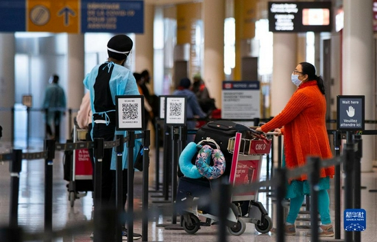 12月21日,在加拿大安大略省多伦多皮尔逊国际机场,戴口罩的入境旅客前往新冠检测站。