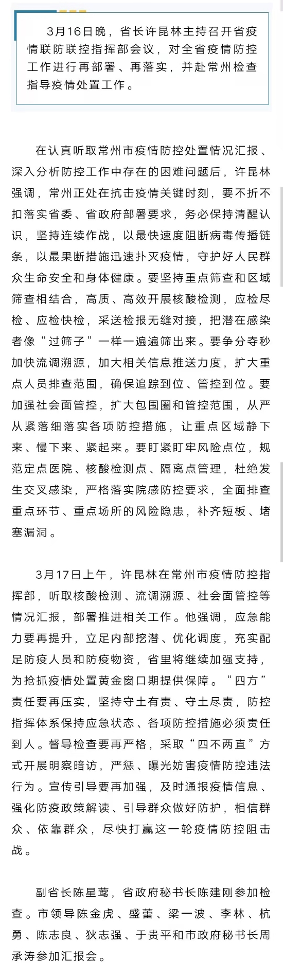紧盯风险点狠抓薄弱处 以最坚决果断措施尽快扑灭疫情 政府网站 03月18日 14:47 关注 确定不再关注此人吗 摘要: 紧盯风险点狠抓薄弱处 以最坚决果断措施尽快扑灭疫情 | 许昆林在常州检查指导疫情处置工作 分享文章到: