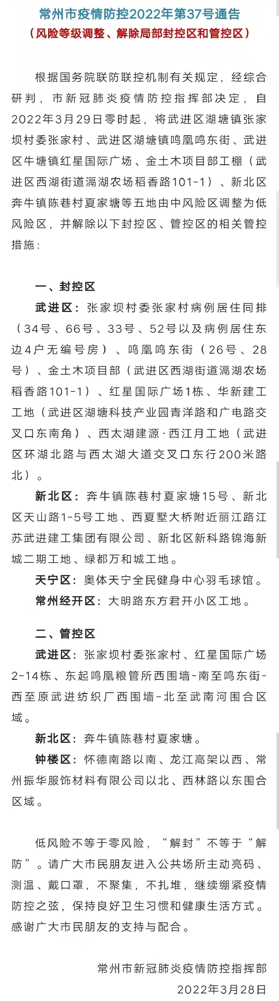 常州市疫情防控2022年第37号通告(风险等级调整、解除局部封控区和管控区) 政府网站 03月29日 10:32 关注 确定不再关注此人吗 摘要: 常州市疫情防控2022年第37号通告(风险等级调整、解除局部封控区和管控区) 分享文章到: