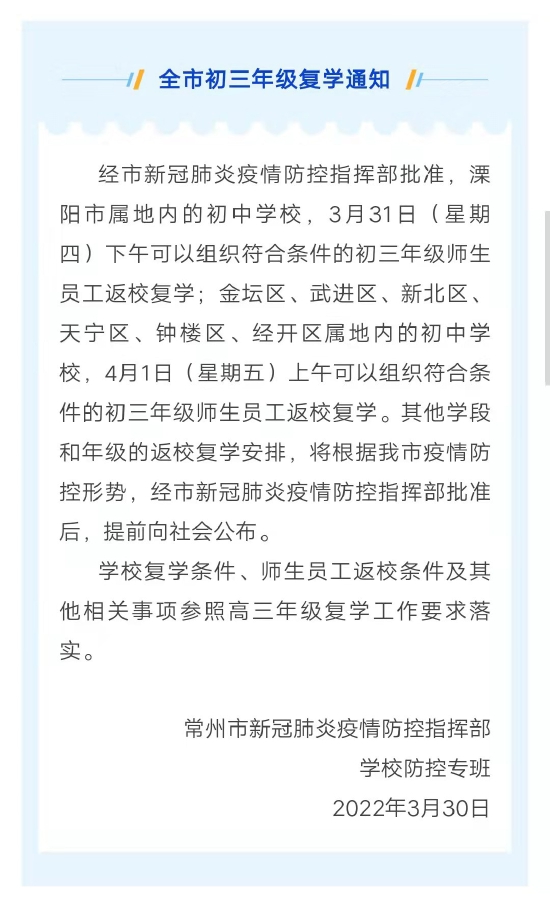 全市初三年级复学通知