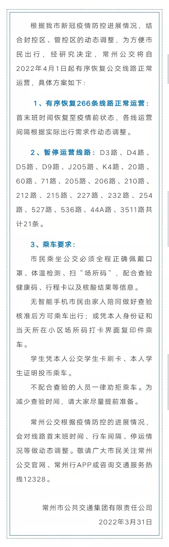 关于常州公交运营线路有序恢复正常运营的通知