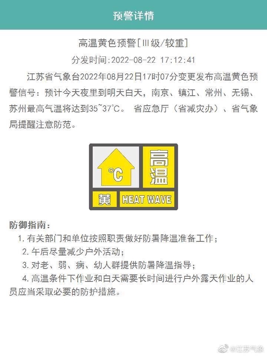 关注江苏省气象台2022年08月22日17时07分变更发布高温黄色预警信号:预计08月22日夜里到23日白天,南京、镇江、常州、无锡、苏州最高气温将达到35~37℃。 省应急厅(省减灾办)、省气象局提醒注意防范。