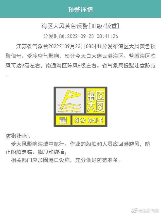 江苏省气象台2022年09月23日08时41分发布海区大风黄色预警信号:受冷空气影响,预计今天白天连云港海区、盐城海区阵风可达9级左右,南通海区阵风8级左右。省气象局提醒注意防范。