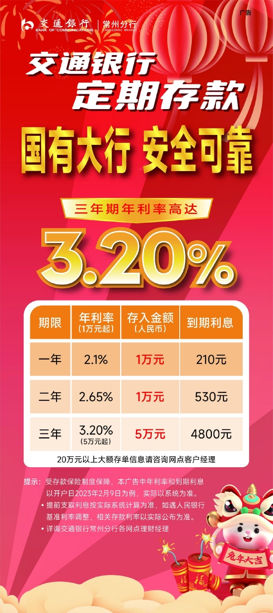交通银行三年定期存款年利率高达3.2% 国有大行 安全可靠! 商讯 03月14日 11:25 关注 确定不再关注此人吗 摘要: 交通银行三年定期存款年利率高达3.2% 国有大行 安全可靠! 交通银行三年定期存款年利率高达3.2% ,国有大行,安全可靠! 分享文章到: