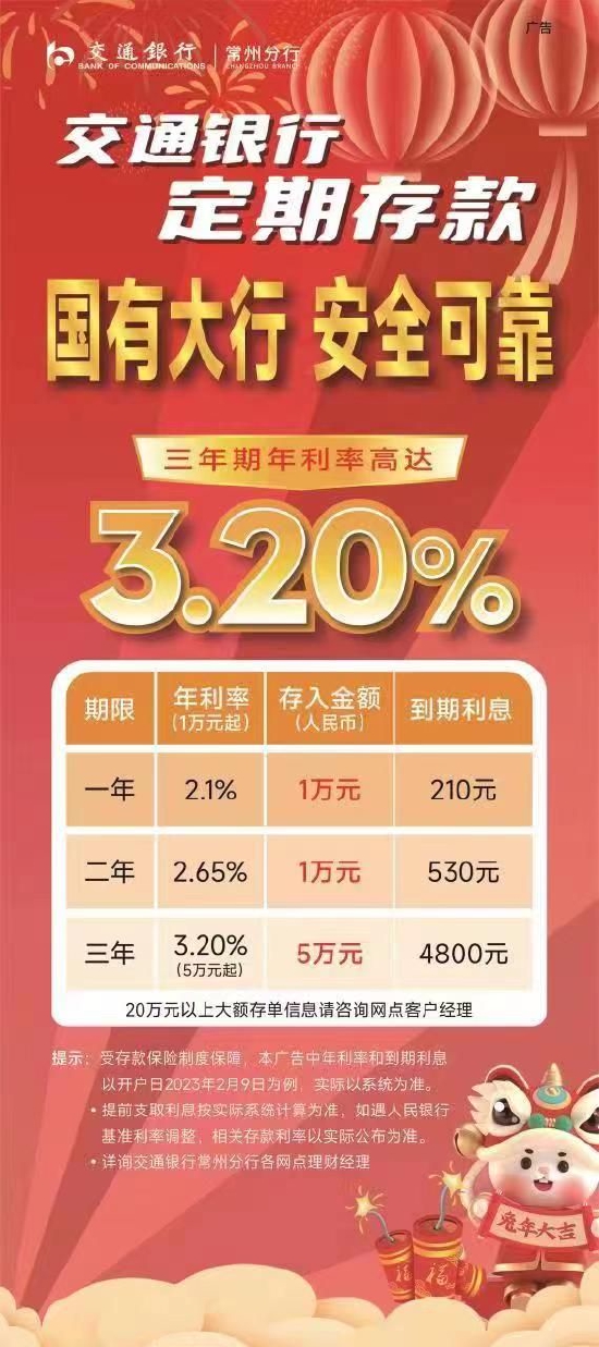 交通银行定期存款 国有大行安全可靠 商讯 03月22日 14:04 关注 确定不再关注此人吗 摘要: 交通银行定期存款 国有大行安全可靠 交通银行定期存款,国有大行安全可靠,三年期定期利率高达3.2%。详询交通银行各网点理财经理。 分享文章到: