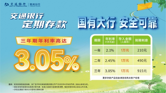 交通银行常州分行三年期定期储蓄年利率可高达3.05%,国有大行、安全可靠!