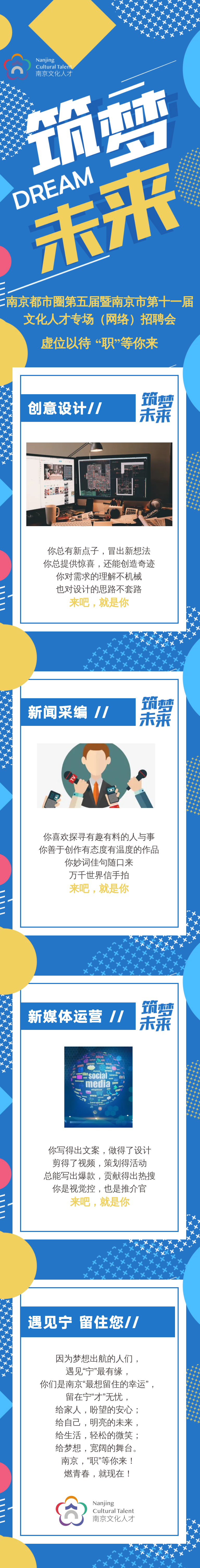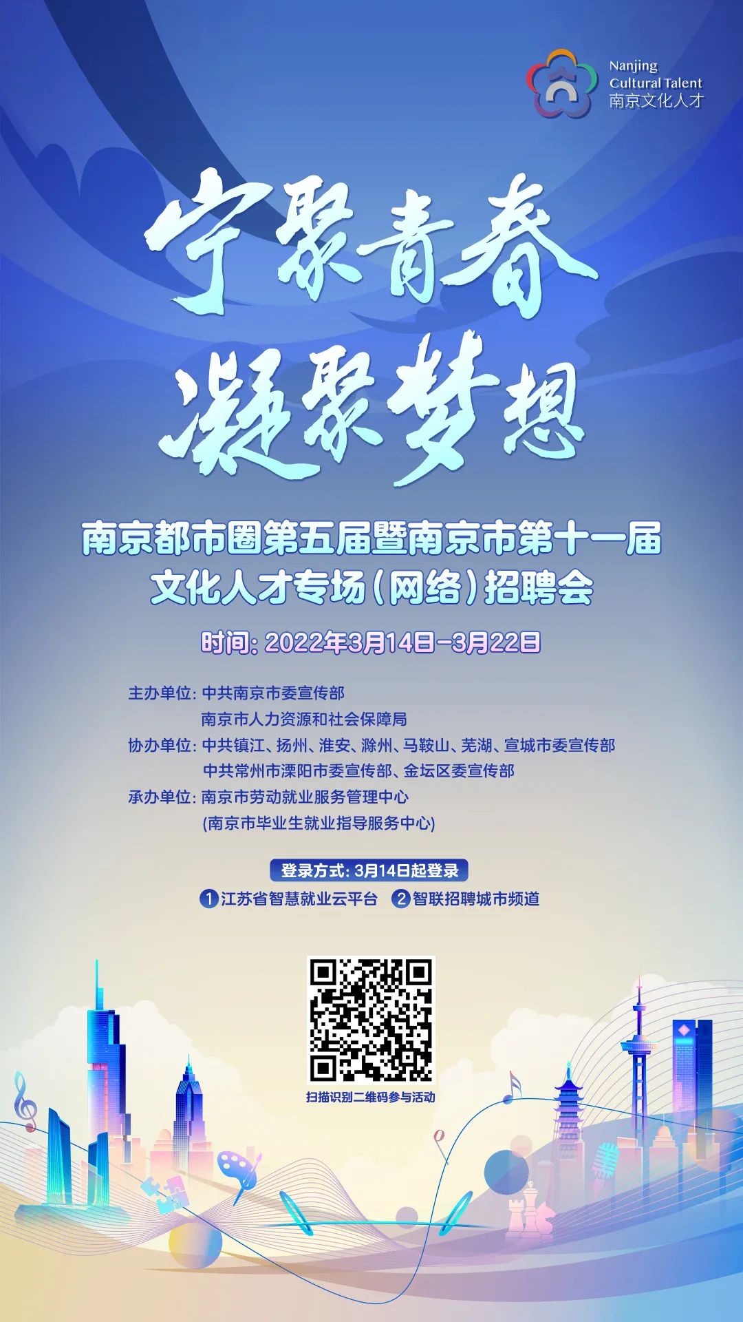 宁聚青春,凝聚梦想!南京都市圈第五届暨南京市第十一届文化人才专场(网络)招聘会3月14日-22日举行。登录“江苏智慧就业云平台”或“智联招聘城市频道”查看详细职位信息。