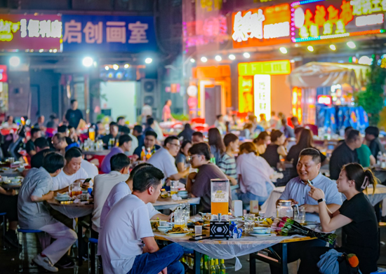 想象一下,当精彩瞬间出现,与上百位素不相识的球迷同好一起共鸣欢呼,激动的声浪、热烈的讨论在晚风中久久不散。冰饮、甜品、西餐……山下街区的烟火气,也为这场夏夜观赛体验增添了一份独有的松弛感。