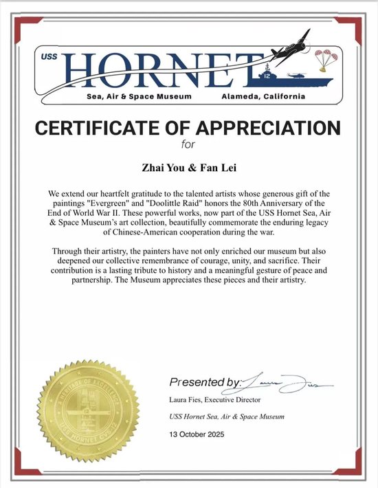 关注“这些艺术作品,不仅丰富了我们的博物馆馆藏,还加深了我们对勇气、团结和牺牲的集体记忆。他们的贡献是对历史的永久纪念,也是和平与合作的有意义的表达。博物馆对这些作品及其艺术价值表示赞赏。“10月13日,美国大黄蜂号航母博物馆CEO劳拉。菲斯为江苏书画艺术代表人物翟优、樊蕾夫妇颁发赞赏证书。证书提到,翟优和樊蕾夫妇慷慨地赠送了《常青》和《杜利特尔突袭》画作,以纪念第二次世界大战结束80周年。这些强大的作品己成为美国海军大黄蜂号航母博物馆艺术收藏的一部分,精美地纪念了战时中美合作的持久遗产。