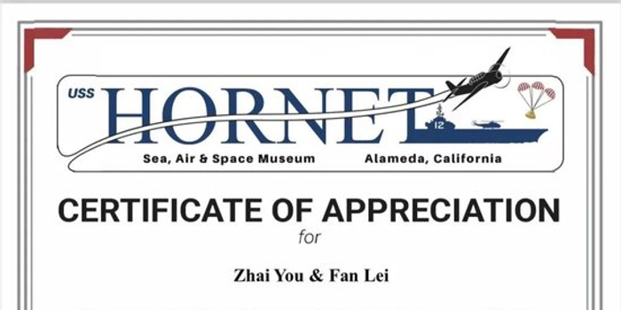 美国大黄蜂号航母博物馆向翟优、樊蕾夫妇颁发赞赏证书