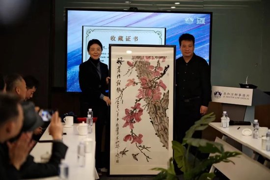 中国画学会副秘书长、江苏省中国画学会会长翟优高度肯定画展价值,他指出,法律人与艺术家的跨界对话,为不同领域思维碰撞提供了宝贵契机,也为艺术创作注入了全新视角与灵感。随后,开幕式现场举行赠画仪式,翟优代表江苏省中国画学会向泰和正雅堂画廊赠送画作,泰和执委会主任朱莉接受画作并向其颁发收藏证书,见证双方跨界合作的深厚情谊。