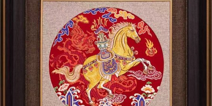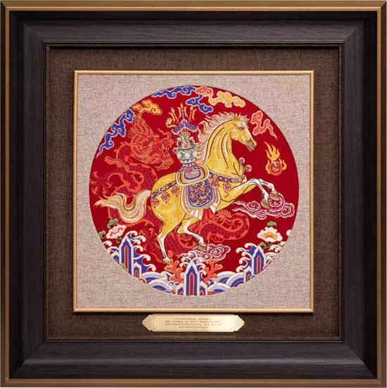 首次公开亮相的《龙腾骏业》,灵感源自清代《乾隆大阅图》,以圆形构图传递“天圆地方”的传统哲学。画面中,一匹金色的骏马昂首腾跃,前蹄离地,展现出矫健的凌空之势,马背上驮着一只宝瓶,寓意“平安吉庆”。南京云锦织造技艺代表性传承人陈诚介绍,该作品在继承古代织造技法的同时,大胆运用现代材料与工艺进行创新,将鸵鸟羽毛与真螺钿线织入锦面,并通过金线晕色技术使马身呈现细腻的光影变化,研发历时4个月。