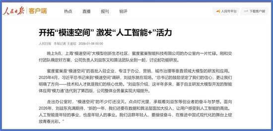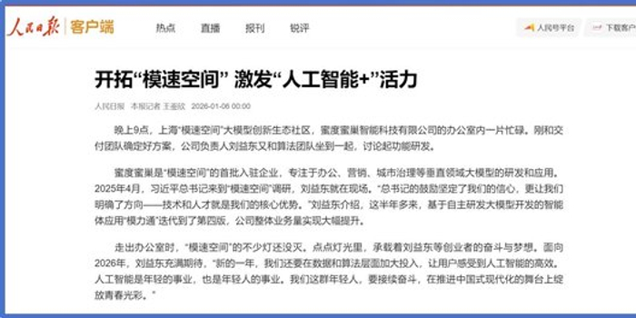 关注1月6日,人民日报一篇题为《开拓“模速空间”激发“人工智能+”活力》的报道中提到:“晚上9点,上海‘模速空间’大模型创新生态社区,蜜度蜜巢智能科技有限公司的办公室内一片忙碌。刚和交付团队确定好方案,公司负责人刘益东又和算法团队坐到一起,讨论起功能研发……”聚焦了上海蜜度蜜巢智能科技有限公司在人工智能技术场景落地与市场拓展领域的扎实实践,蜜度蜜巢是“模速空间”的首批入驻企业,专注于办公、营销、城市治理等垂直领域大模型的研发和应用。