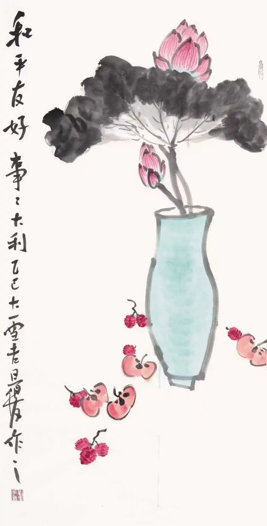 此次被收藏的《和平友好 事事大利》是翟优创作的精品力作,作品以中国传统视觉象征手法与谐音文化为创作核心,构建出层次丰富、意蕴深远的艺术表达。画面中央,瓷瓶中盛放的莲花清雅脱俗,“荷”谐音“和”、“瓶”谐音“平”,二者相融相生,构成“和平”的美好文化隐喻;而莲花本身所承载的纯洁、平衡之意,更深化了不同文明和谐共处的理念。围绕中心构图的四枚红柿与九颗荔枝相映成趣,“柿”谐音“事”、“荔”谐音“利”,寓意“事事顺遂、福泽绵长”,既传递了中国传统吉祥文化的独特智慧,更寄托了中美两国携手共赢、繁荣发展的美好愿景。作品笔墨清雅灵动,色彩温润和谐,将东方美学的含蓄之美与当代国际视野完美融合,堪称跨文化艺术表达的典范之作。