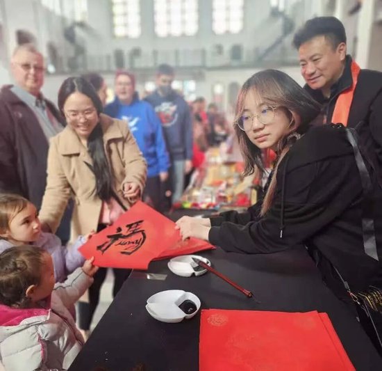 活动现场暖意融融、翰墨飘香。艺术家翟优、樊蕾与小书法家翟悦涵现场挥毫泼墨,精心书写“福”字、“马上有福”“马上有钱”等饱含新春寓意与马年吉祥祝福的书法作品,免费赠予到场的美国民众。红纸衬墨色,福韵传温情,当地民众有序排队、热情参与,手持墨宝驻足合影,沉浸式体验中国传统年俗与书法艺术的独特魅力,现场洋溢着欢乐祥和的新春氛围。