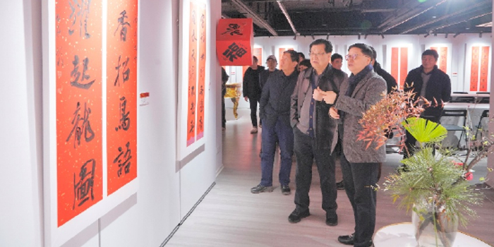 展览中,中国书法家协会理事、江苏省书法家协会副主席、江苏省书法院院长李啸在开幕式上围绕“如何用书法创作好一副楹联作品”的话题,从“源远流长:楹联与书法的历史共生关系”“独具匠心:楹联书法的艺术特点与创作要求”“雅俗共赏:春联书法创作的大众美学风格”三个方面所作论述,是黄正明教授向参观者介绍的重中之重。