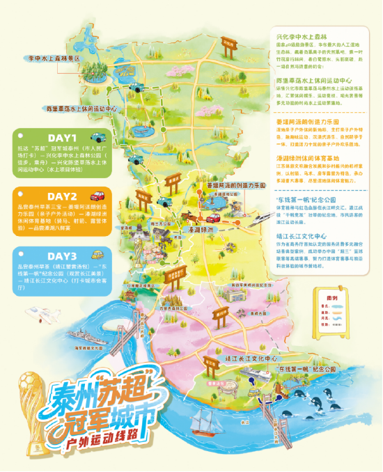 据悉,此次发布的精品线路各具特色,涵盖冰雪运动、山水驰骋、人文体验等多种类型,实现全域覆盖。“苏超”冠军城户外运动线路充分结合泰州自然禀赋与时尚体育项目,以体育旅游为主线,串联泰州北、中、南三个市(区),从水网密布的里下河延伸至浩瀚奔腾的长江边。线路整合了兴化李中水上森林公园、姜堰溱湖绿洲休闲体育基地、靖江长江文化中心等特色文体旅融合点位,同时融入泰州早茶、溱湖八鲜宴、靖江蟹黄汤包等本土美食,形成集生态观光、亲子互动、体育运动、文化体验于一体的多元行程,兼顾运动乐趣与文化内涵,可满足不同人群的出行需求。