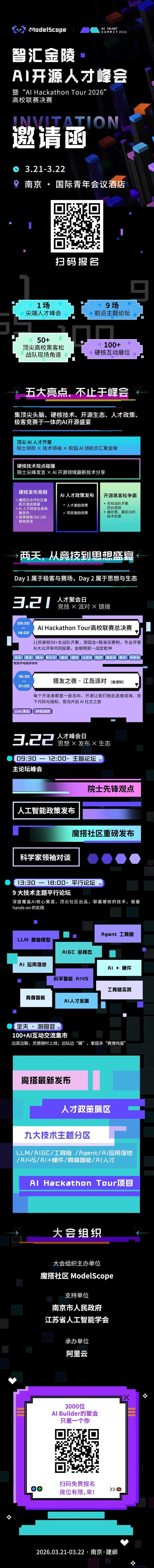 魔搭社区ModelScope(modelscope.cn),是中国最大模型开源社区,始终坚持开放、中立、非盈利的原则。魔搭社区于2022年11月由CCF开源发展技术委员会和阿里巴巴共同发起,致力于为全球开发者、研究者和企业提供高质量、易用、可扩展的AI模型及工具,推动人工智能技术的开放共享与产业落地。