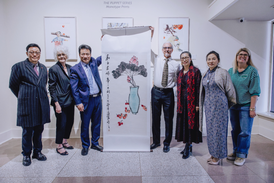 当天晚上,格雷斯博物馆举行作品收藏仪式,翟优创作的《和平友好事事大利》被博物馆正式永久收藏。这幅作品利用谐音寓意,“荷”代表“和”、“瓶”代表“平”、“柿”代表“事”、“荔”代表“利”,把中华传统吉祥文化和中美友好的美好心愿结合在一起,成为中美民间文化交流的珍贵纪念。这也是艾比林格雷斯博物馆第一次收藏中国当代艺术家的作品,体现了美国艺术界对中华文化的高度认可。中国驻美大使馆负责文化和旅游事务的陈春梅公参指出,中美艺术的以艺通心是推动中美民间文化交流走深走实的具体实践。“中国驻美使馆将继续搭建交流桥梁,在全球文明倡议引领下,以人文交流促进中美关系稳定、健康、可持续发展。”