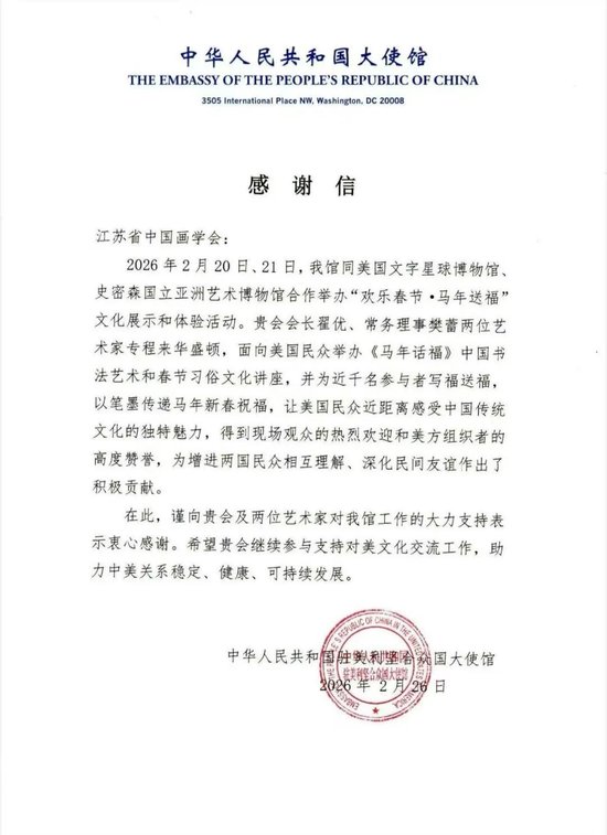 2月21日,在史密森国立亚洲艺术博物馆,艺术家们现场创作“马上有福”等书法作品,不少美国民众第一次近距离体验正宗的中国年俗文化,真切感受到中华传统文化的独特魅力。从校园到博物馆,从专业艺术交流到民间暖心活动,学会用多种形式让中华文化在美国得到广泛传播。中国驻美大使馆专门向江苏省文旅厅、江苏省中国画学会发来感谢信,感谢翟优、樊蕾用笔墨送上马年新春祝福,让美国民众近距离感受中华文化魅力,活动受到现场观众的热烈欢迎和美方组织者的高度赞扬,为增进两国人民相互理解、加深民间友谊作出了积极贡献。