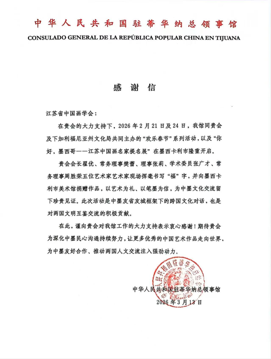 中国驻蒂华纳总领馆在感谢信中,对江苏省中国画学会的鼎力支持表示衷心感谢,高度评价学会在推动中墨民心相通、文化互鉴方面发挥的重要作用,期待学会持续深耕国际文化交流领域,让更多优秀中国艺术作品走向世界舞台,为深化中墨友好合作、推动两国人文交流持续发展注入强劲动力。