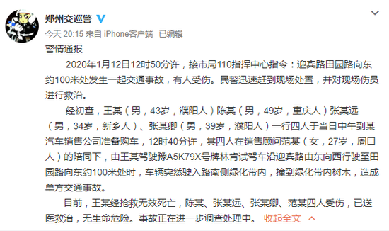 新京报快讯 据郑州市公安局交通巡逻警察支队官方微博消息,1月12日,一名男子在购车过程中,驾驶一辆林肯试驾车时发生交通事故,致1人死亡,4人受伤。