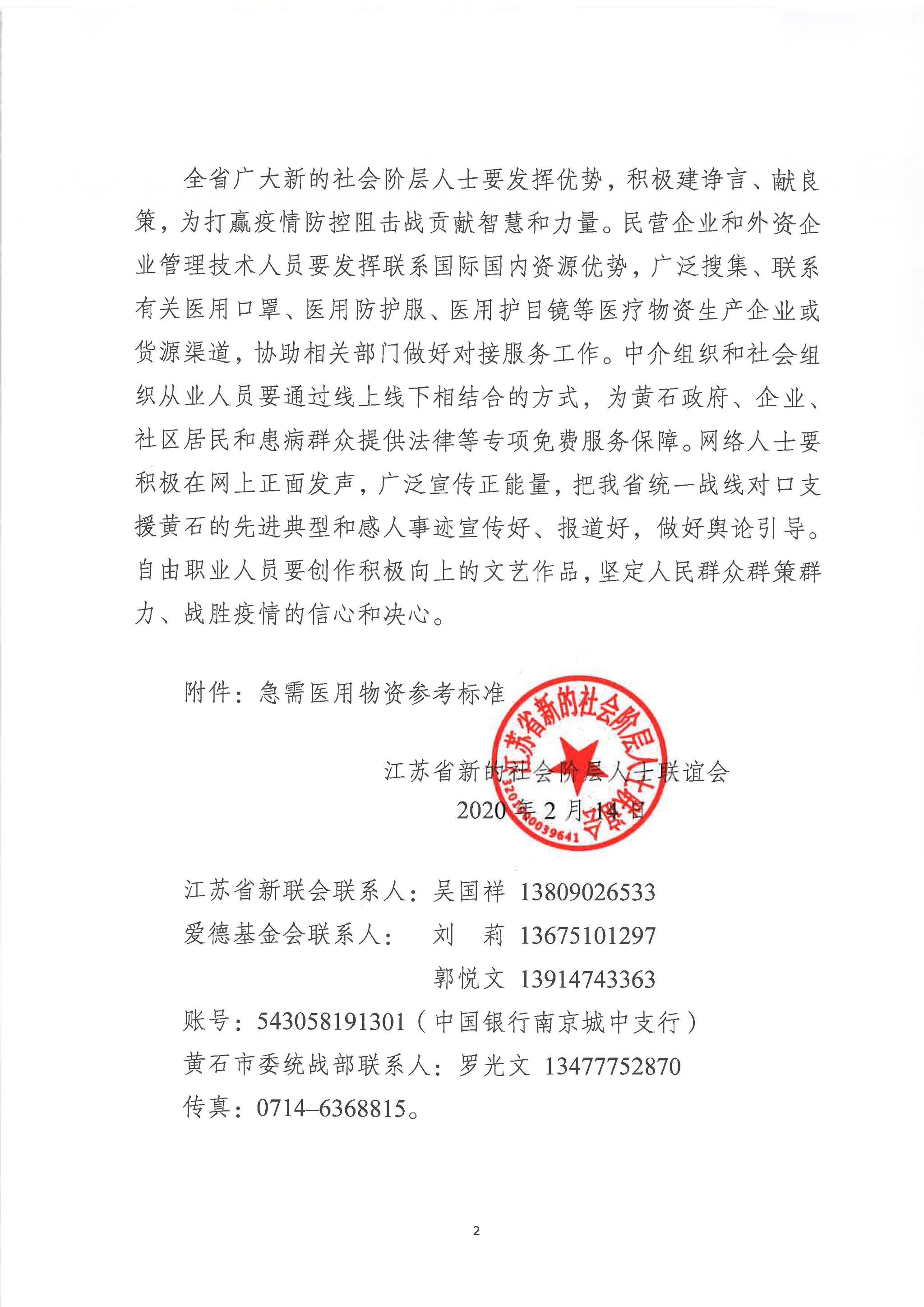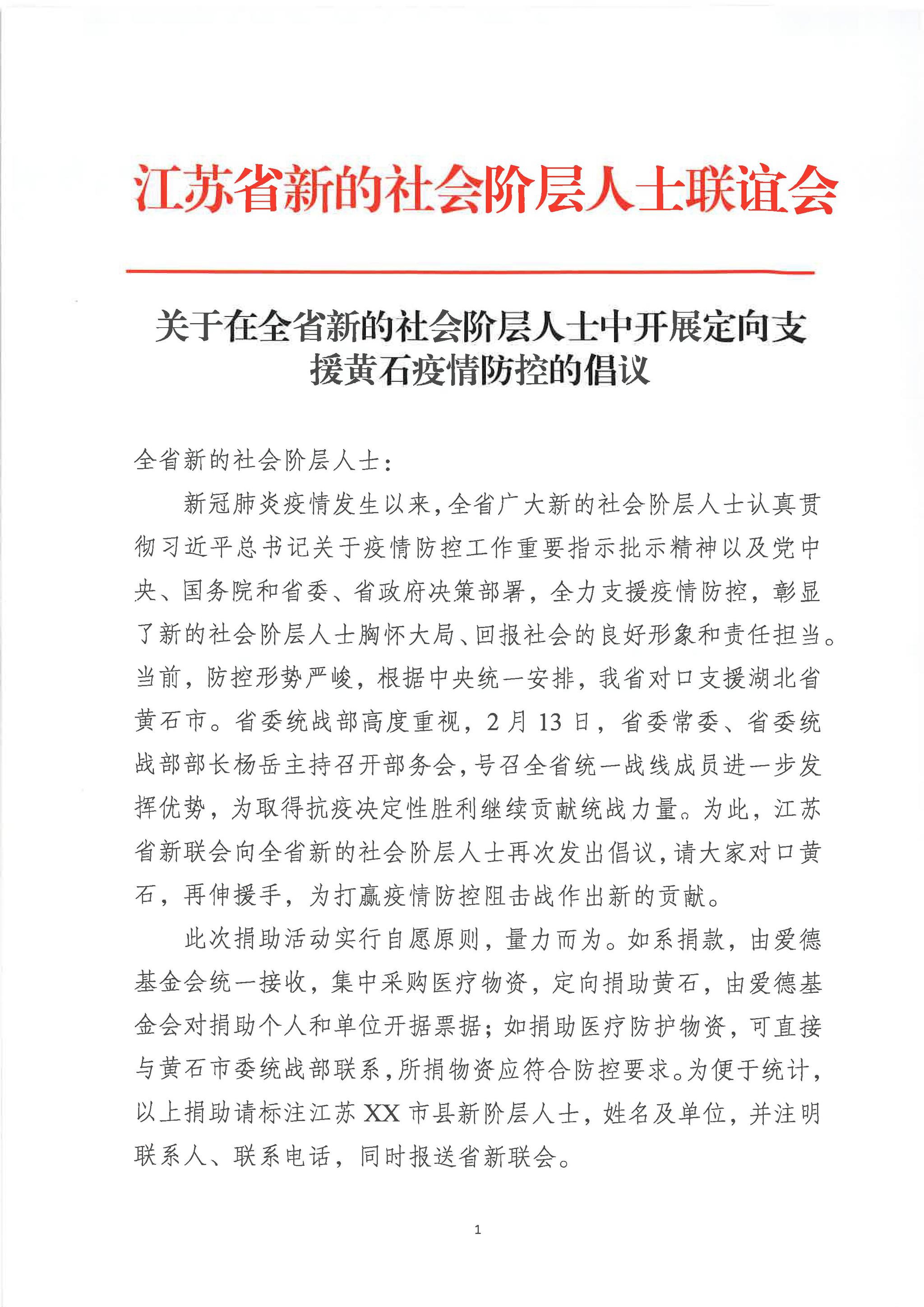 江苏省新的社会阶层联谊会倡议:定向支援黄石疫情防控