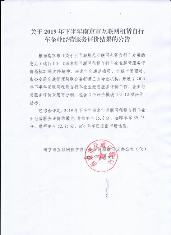 据南京市交通运输局官网,3月9日,南京市交通运输局发布2019 年下半年南京市互联网租赁自行车企业经营服务评价结果的公告。公告显示,ofo单车已经退出市场运营。