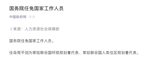 任命周平剑为常驻联合国环境规划署代表、常驻联合国人类住区规划署代表。