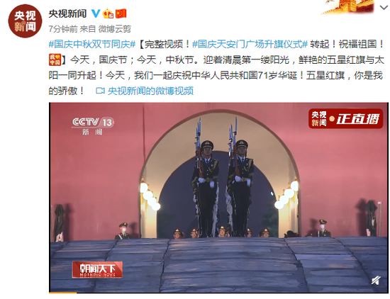完整视频!国庆天安门广场升旗仪式 央视 10月01日 07:53 关注 确定不再关注此人吗 今天,国庆节;今天,中秋节。迎着清晨第一缕阳光,鲜艳的五星红旗与太阳一同升起!今天,我们一起庆祝中华人民共和国71岁华诞!五星红旗,你是我的骄傲! 分享文章到: