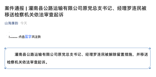 江苏一公路运输有限公司经理被审查起诉 政府网站 01月09日 07:34 关注 确定不再关注此人吗 灌南县公路运输有限公司原党总支书记、经理罗连民被解除留置措施,并移送检察机关依法审查起诉。 分享文章到: